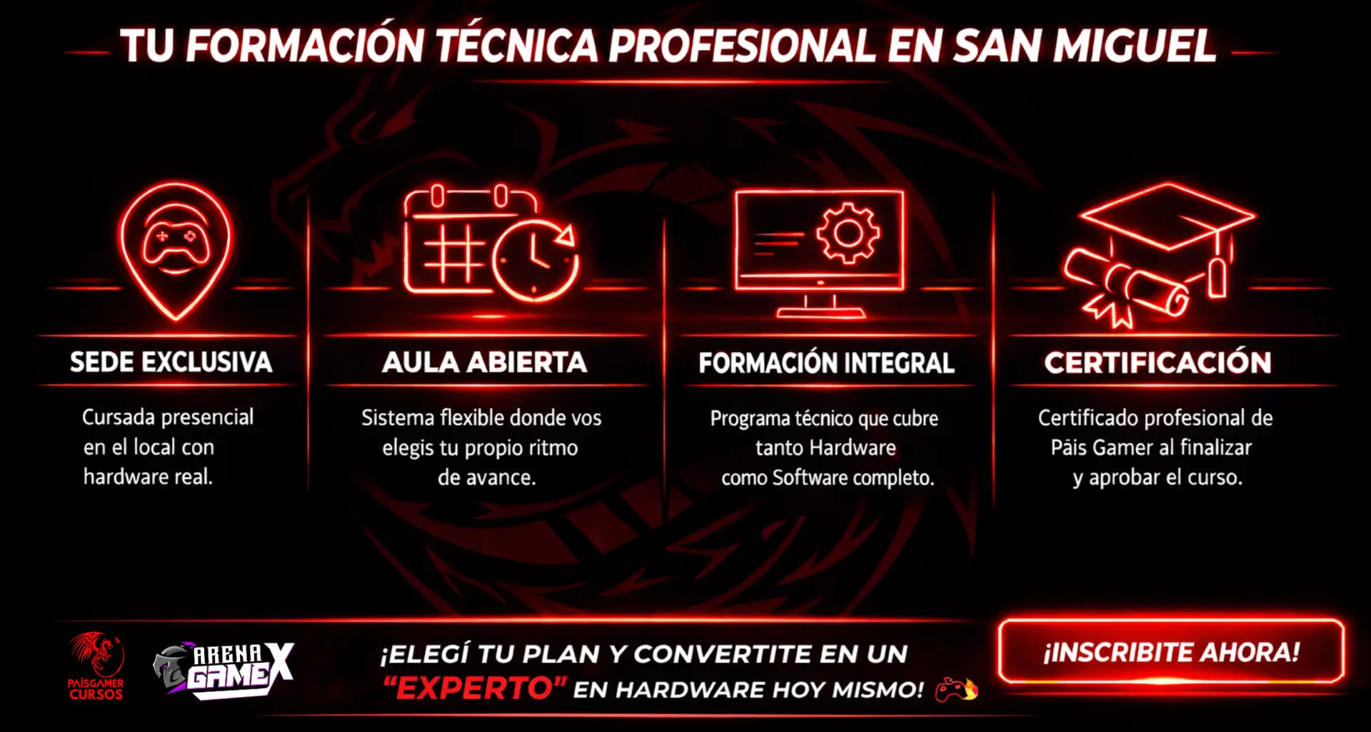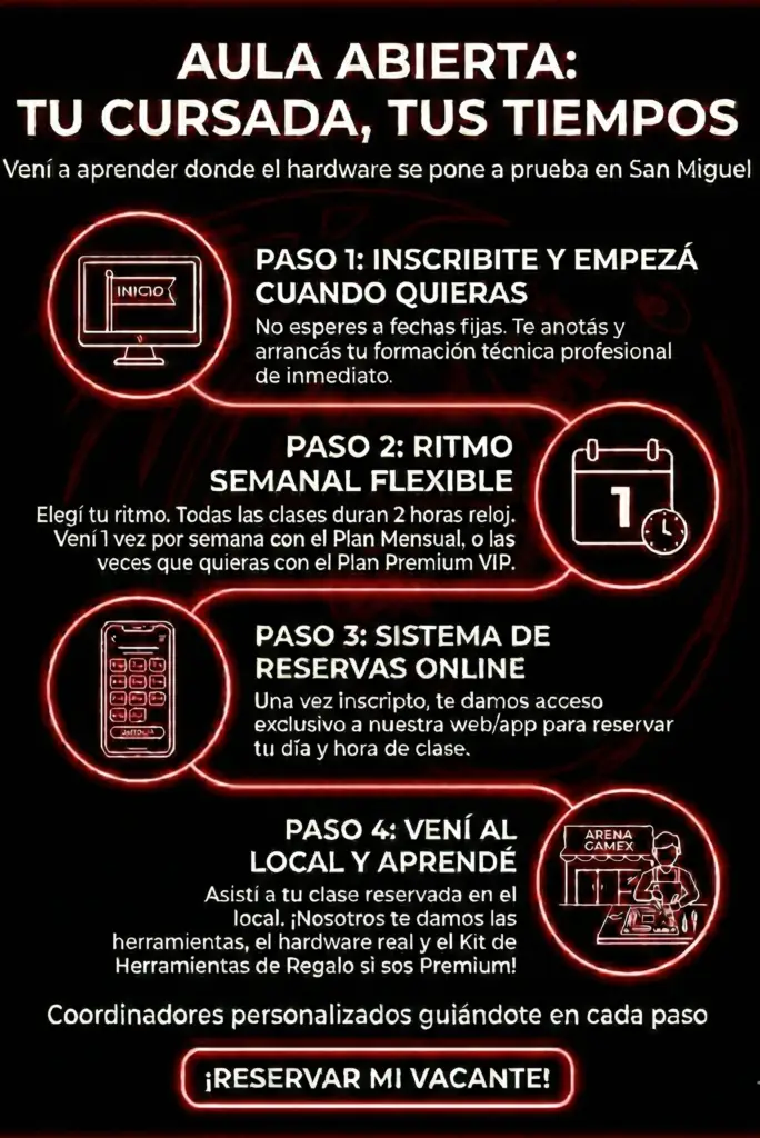 ¡Sí! No hace falta que traigas nada. En el local de Arena GameX te brindamos todas las herramientas profesionales y el hardware real para que practiques en cada clase. Podés arrancar tu formación técnica profesional desde cero absoluto aunque no tengas equipo en tu casa.