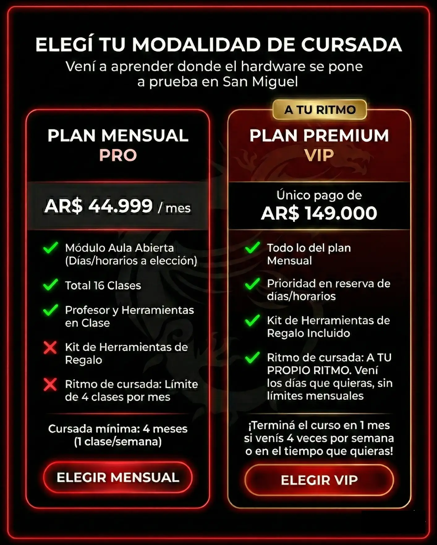 Tenés dos opciones: el Plan Mensual (cuota por mes con 4 clases) o el Plan Premium VIP (un solo pago por el curso completo con acceso ilimitado para terminarlo más rápido).